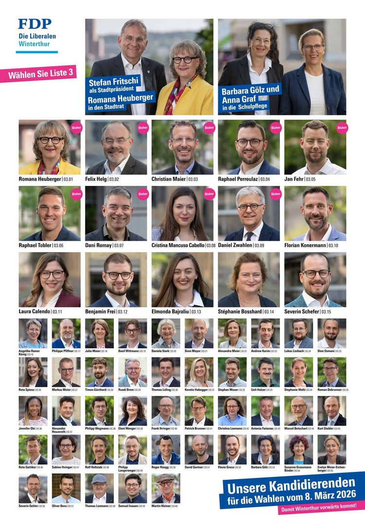 Die Kandidatinnen und Kandidaten der FDP stehen für eine Politik, die Leistung anerkennt, Eigenverantwortung fördert und den Mittelstand entlastet. Sie setzen sich ein für eine Stadt, die wirtschaftlich stark, finanziell gesund und sozial ausgewogen bleibt. Dazu gehören alle Bisherigen, darunter Stadtratskandidatin Romana Heuberger, der Stadtparlamentspräsident 24/25 Felix Helg und FDP-Präsident Raphael Tobler. Neu zur Wahl stehen unter anderem Laura Calendo, Head of Corporate Communications & Public Affairs, und Benjamin Frei, Co-Präsident der kantonalen Steuerrabatt-Initiative. Mit Florian Konermann, Philippe Pfiffner und Ueli Holzer engagieren sich auch ein Sales Manager, ein Journalist und Moderator sowie der Gründer des Weinfestivals Planscher aktiv für den Mittelstand. Auf weiteren Spitzenplätzen kandidieren Elmonda Bajraliu, Gründungsmitglied des Jugendparlaments, Risikomanagerin Stéphanie Bosshard und Severin Schefer, Unternehmer und Präsident Radfahrerverein Winterthur.